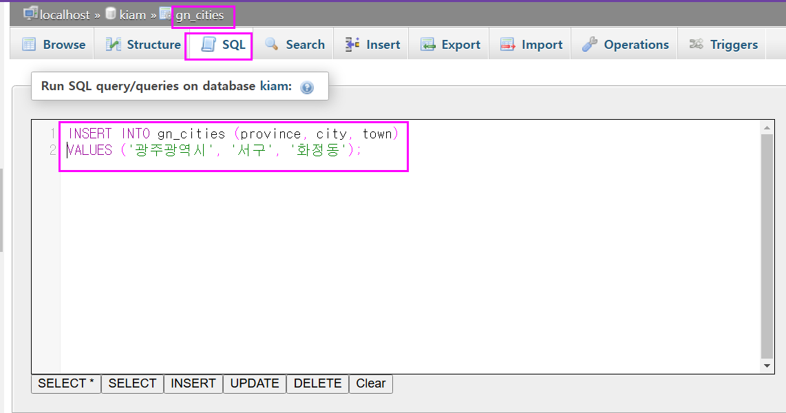 VALUES ('광주광역시', '서구', '화정동');